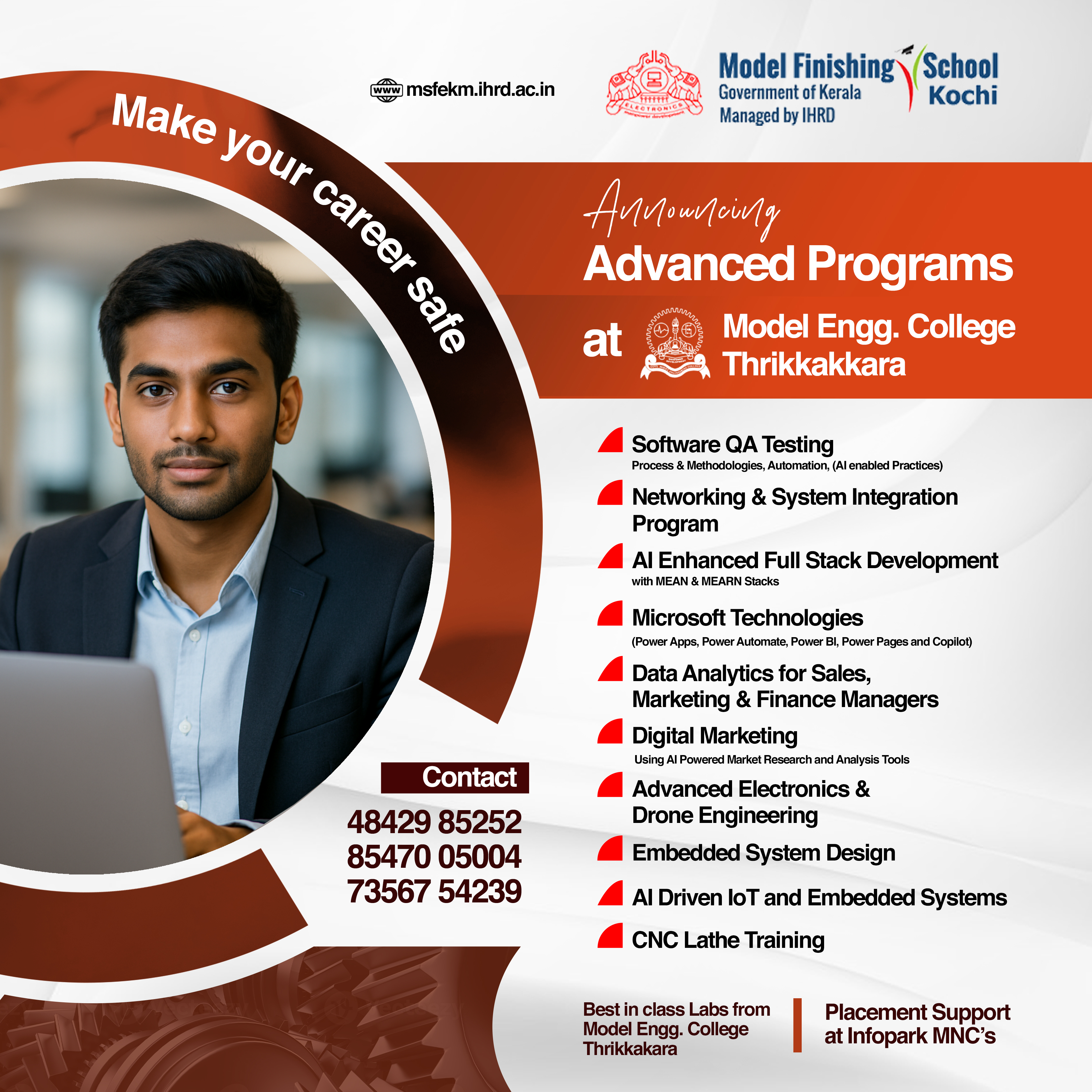 Model Finishing School, the second of its kind under IHRD was established after the initial success of MFS, Thiruvananthapuram. Bridging the employability gap has been the primary motto. Skilling students in Electronics, Information Technology and various other fields, MFS, Ernakulam has gained recognistion as leading training Institute. Off late, we have embarked on internships as well for Graduates in all fields. Located in the Jawaharlal Nehru International Stadium Complex, we all well connected by Metro, Bus and train.